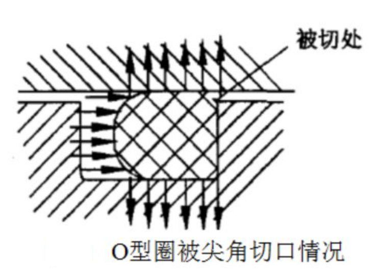 1)在缸筒、活塞、活塞杆和导向套等端部采用15~300的光滑引入角。装配密封件时,密封件经过的零件尖角应去毛刺、倒角。如图所示为O型圈被尖角切口情况。